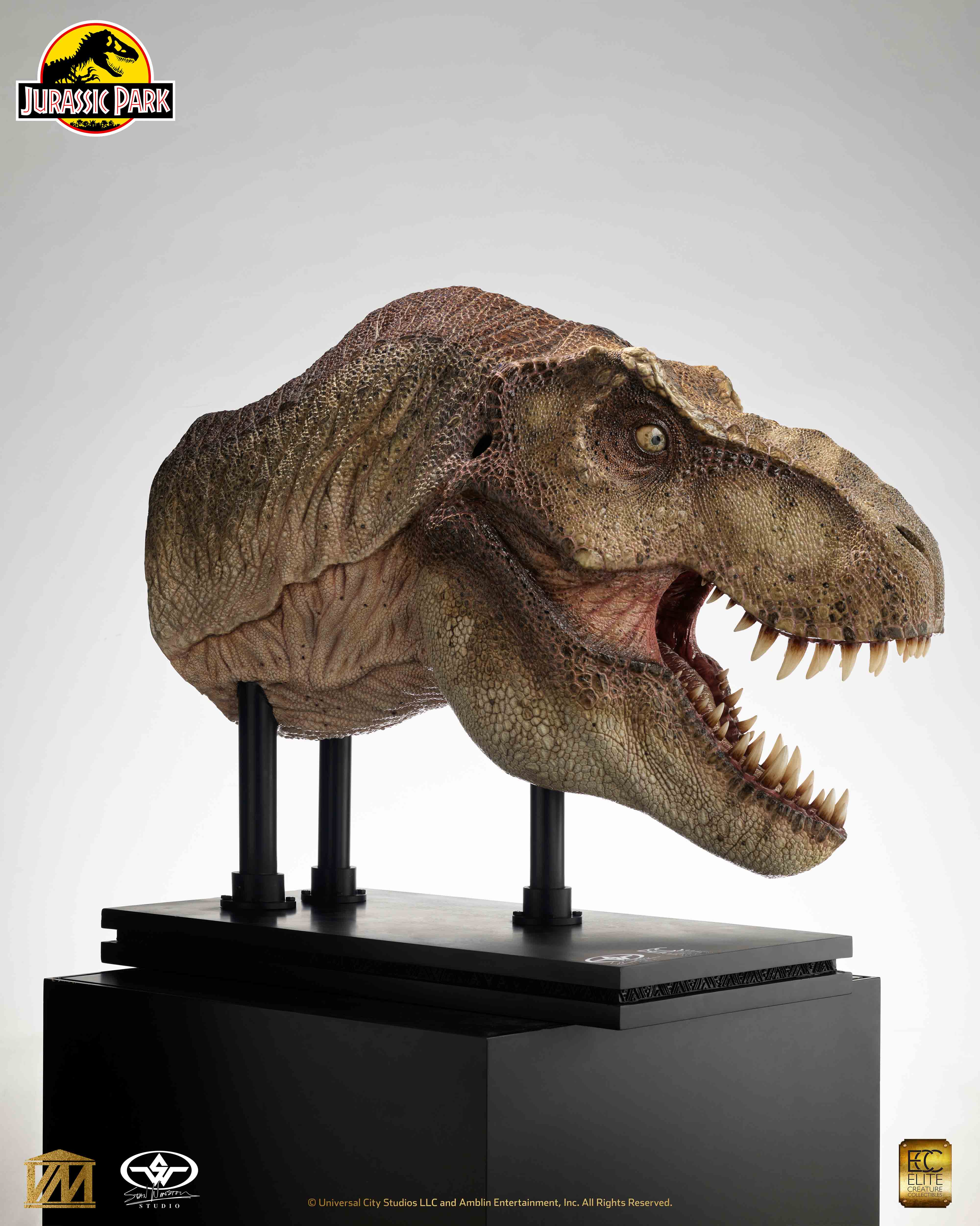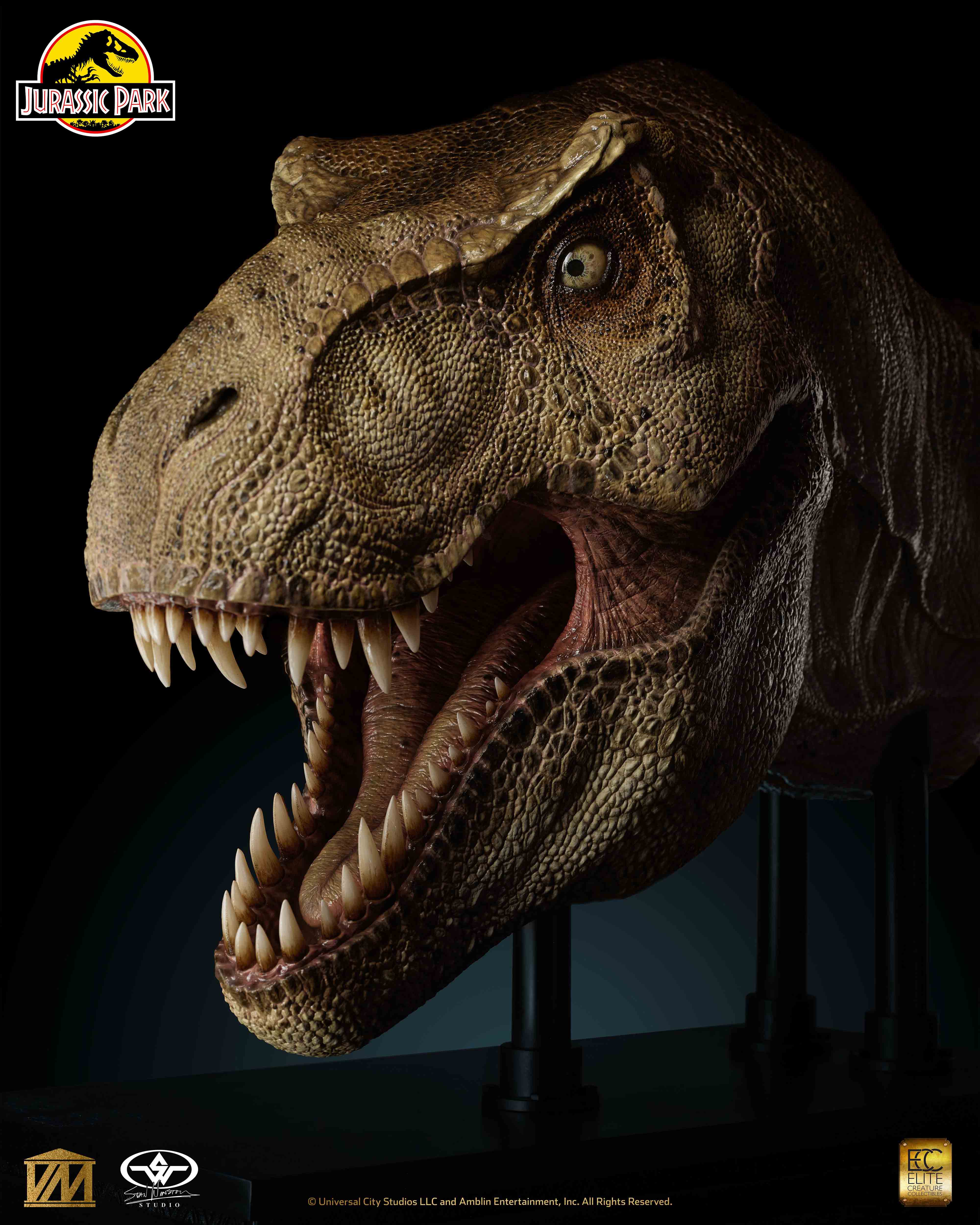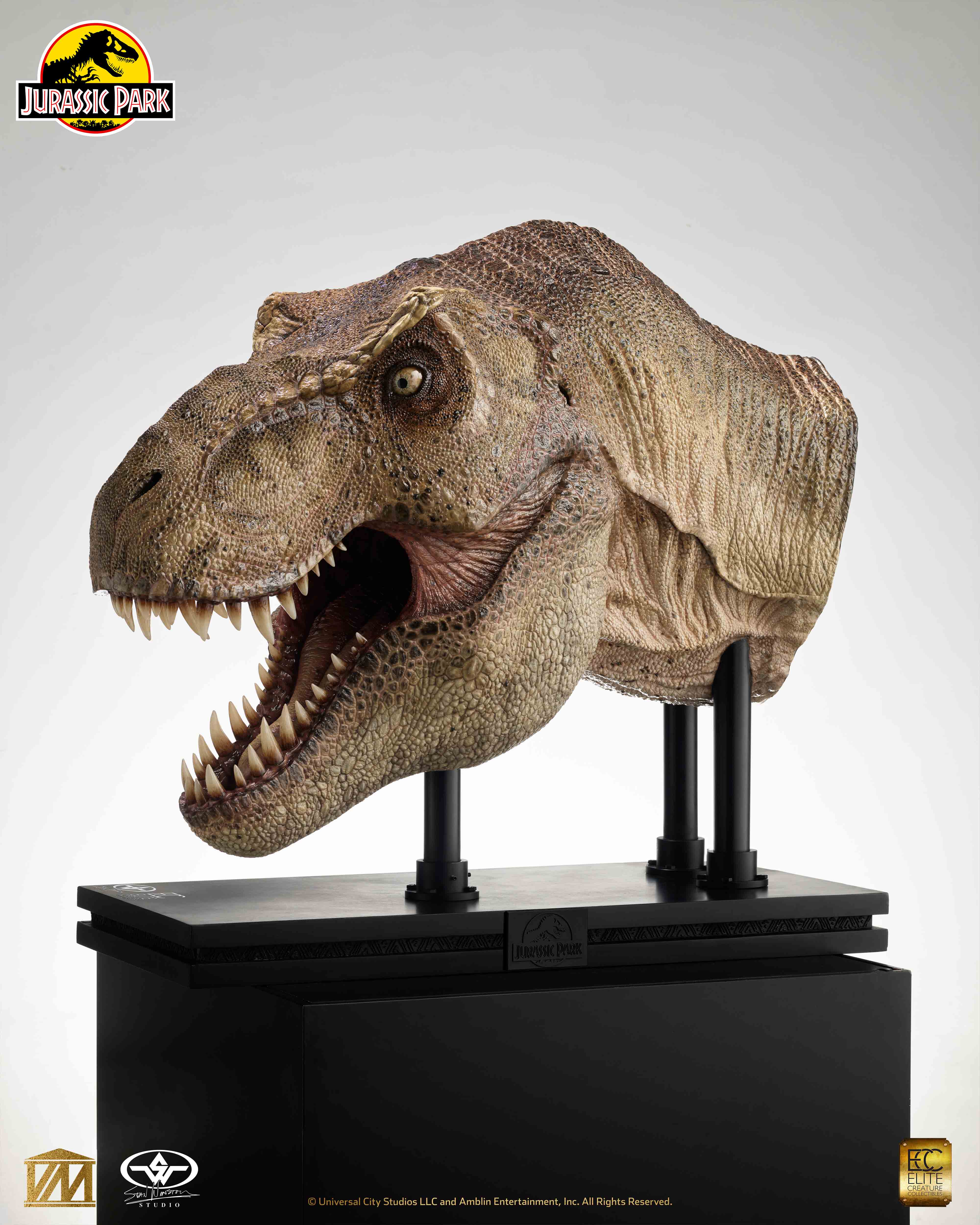 Elite Creature Collectibles is proud to present a 1/2 Scale Tyrannosaurus rex Head Prop reproduction from Jurassic Park (1993) in collaboration with Stan Winston Studio. In addition to an army of artists and technical wizards, the original Jurassic Park T.rex team at Stan Winston Studio included lead sculptor Mike Trcic, paint scheme designer John Rosengrant, and key teeth and eye artist Rob Hinderstein. With great support from Greg Nicotero, the ECC team had hands-on access to one of the original Jurassic Park film props for high-resolution 3D scanning. With this information, as well as extensive archival reference material courtesy of the Stan Winston Studio Archives, ILM key artist Bitan crafted a faithful recreation of the original character from the film, while ECC key artists Miyo Nakamura and Miranda Jory painstakingly matched the T.rex’s iconic paint scheme.