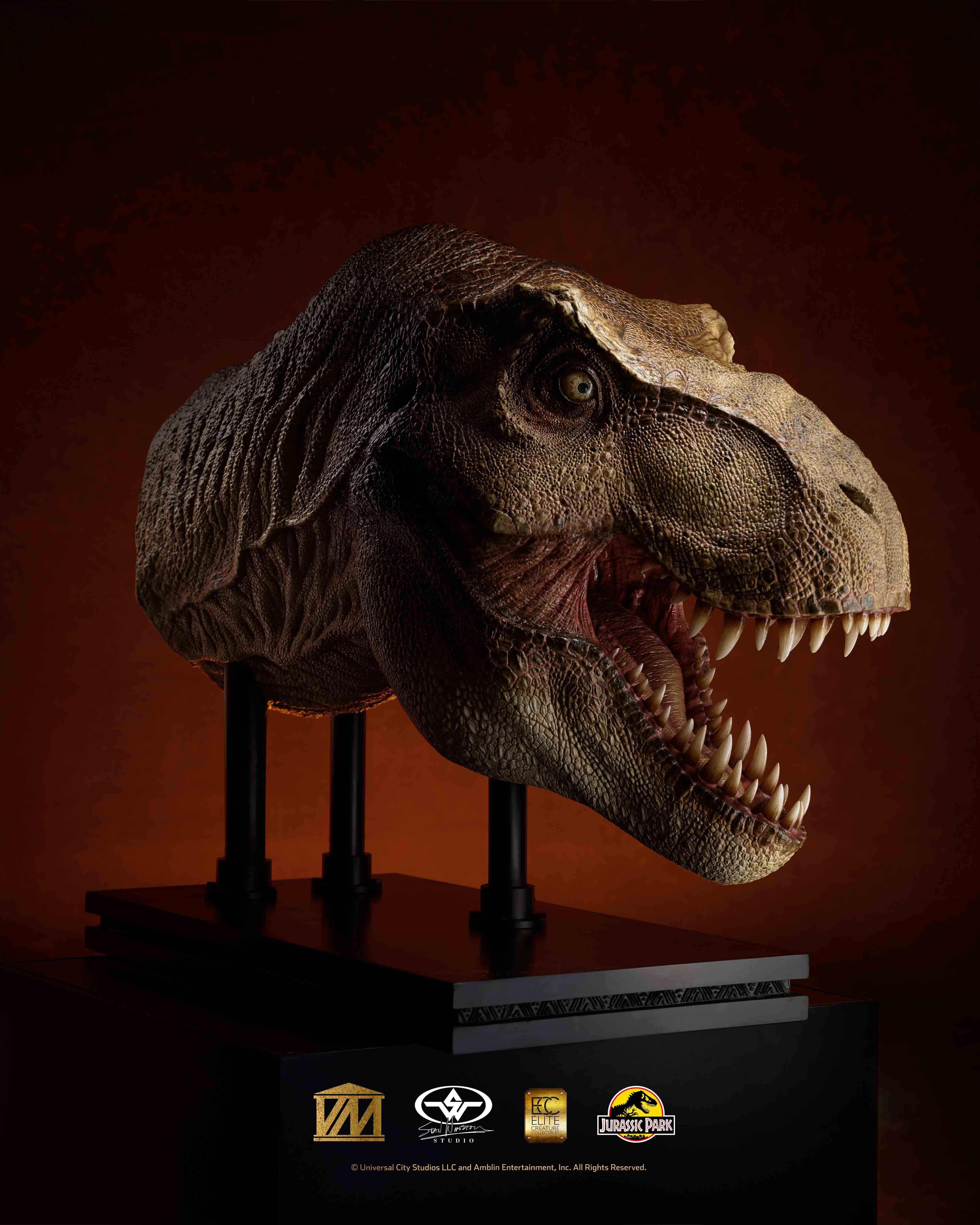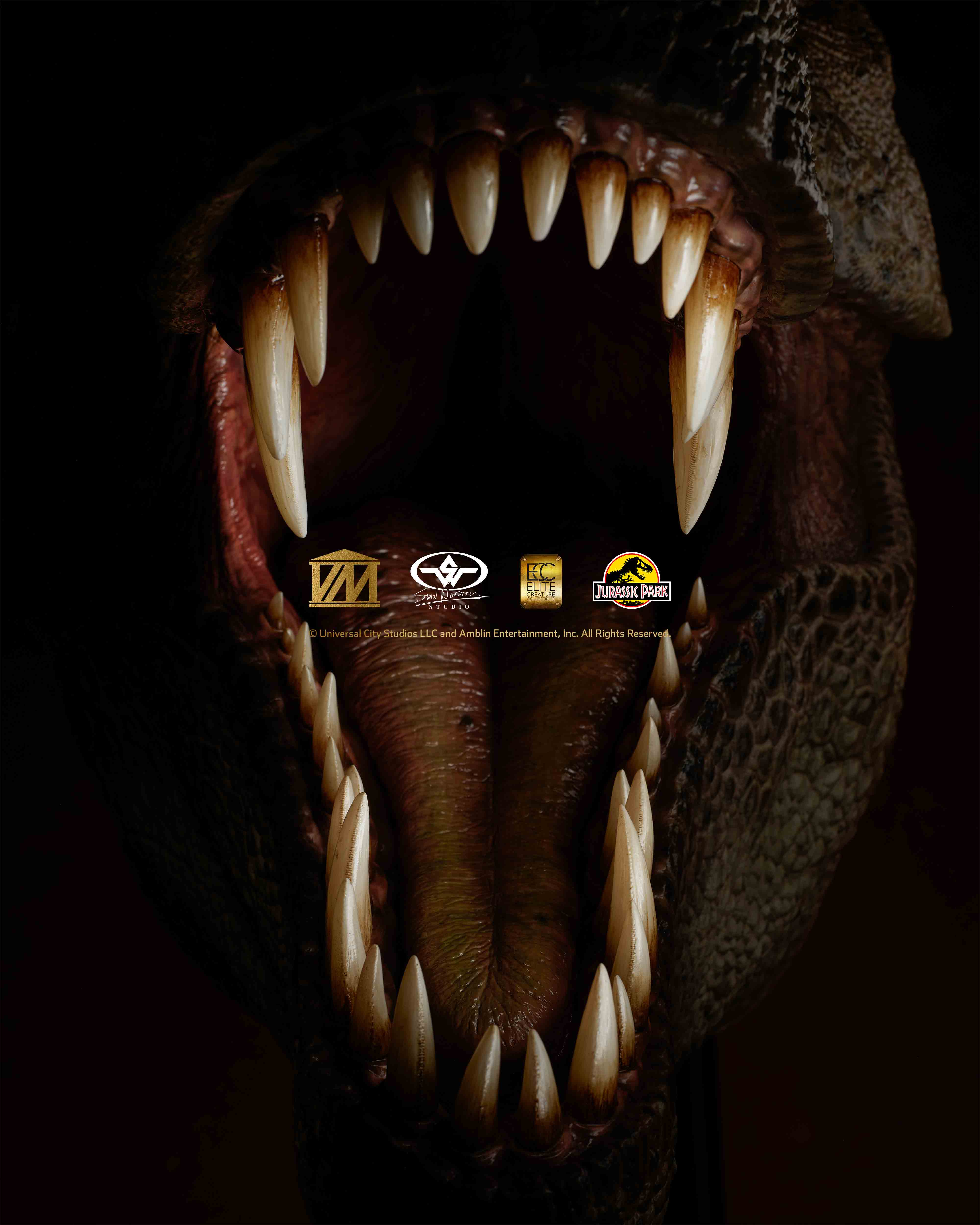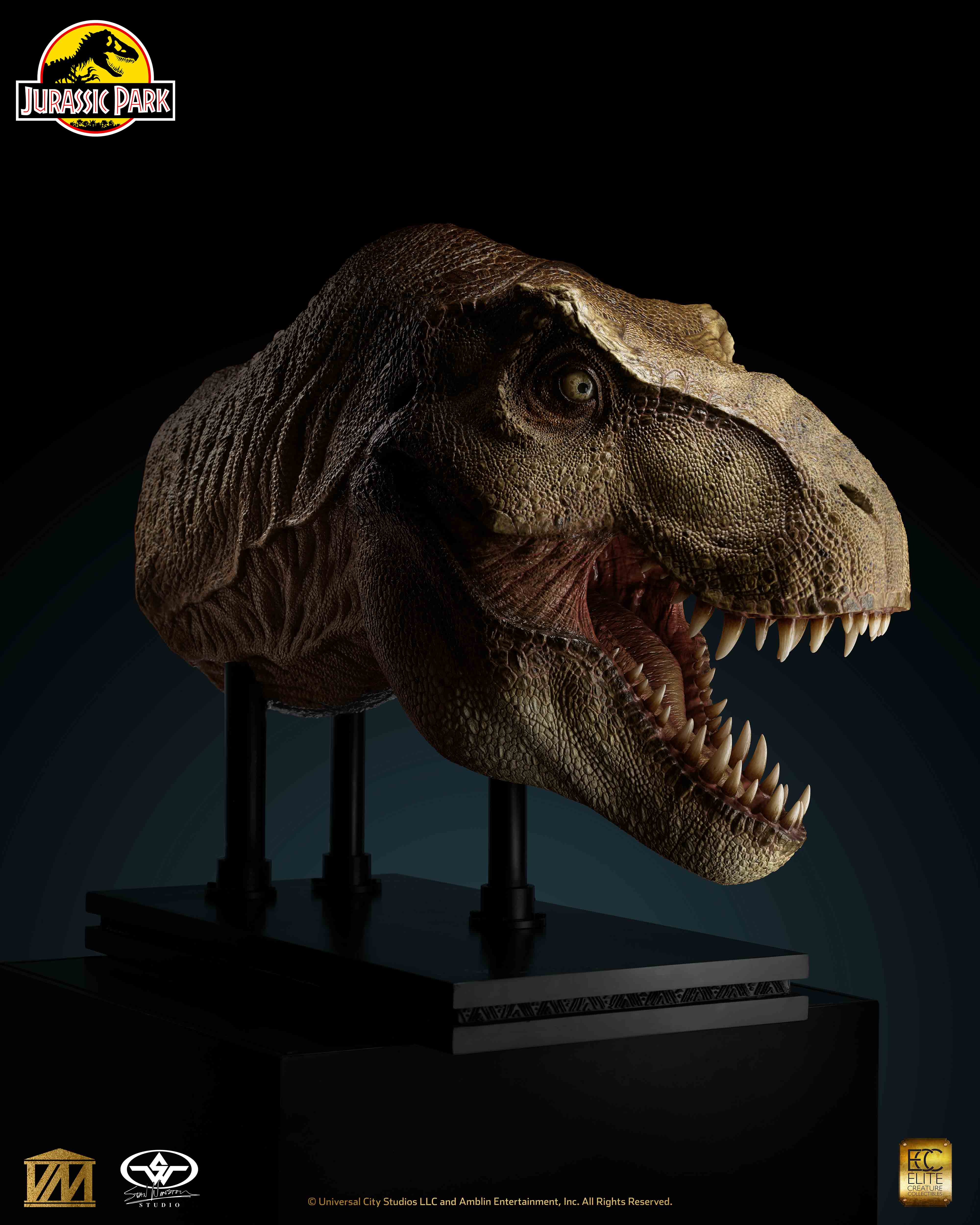Elite Creature Collectibles is proud to present a 1/2 Scale Tyrannosaurus rex Head Prop reproduction from Jurassic Park (1993) in collaboration with Stan Winston Studio. In addition to an army of artists and technical wizards, the original Jurassic Park T.rex team at Stan Winston Studio included lead sculptor Mike Trcic, paint scheme designer John Rosengrant, and key teeth and eye artist Rob Hinderstein. With great support from Greg Nicotero, the ECC team had hands-on access to one of the original Jurassic Park film props for high-resolution 3D scanning. With this information, as well as extensive archival reference material courtesy of the Stan Winston Studio Archives, ILM key artist Bitan crafted a faithful recreation of the original character from the film, while ECC key artists Miyo Nakamura and Miranda Jory painstakingly matched the T.rex’s iconic paint scheme.