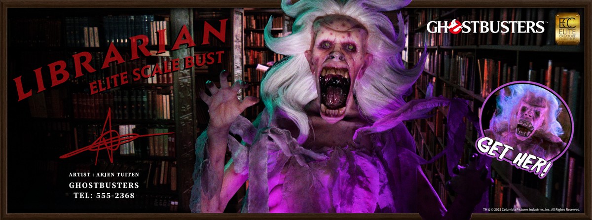 Elite Creature Collectibles is proud to present the Librarian Elite Scale (2/3 Scale) Bust, created in collaboration with Arjen Tuiten, the special makeup and creature effects designer for the Ghostbusters franchise, including Ghostbusters: Afterlife and Ghostbusters: Frozen Empire. Tuiten is known for creating and designing practical effects for ghosts and creature characters, such as the “Old Miner Ghost,” updating Gozer’s look, and conceptualizing the “Polter” ghost for Frozen Empire.