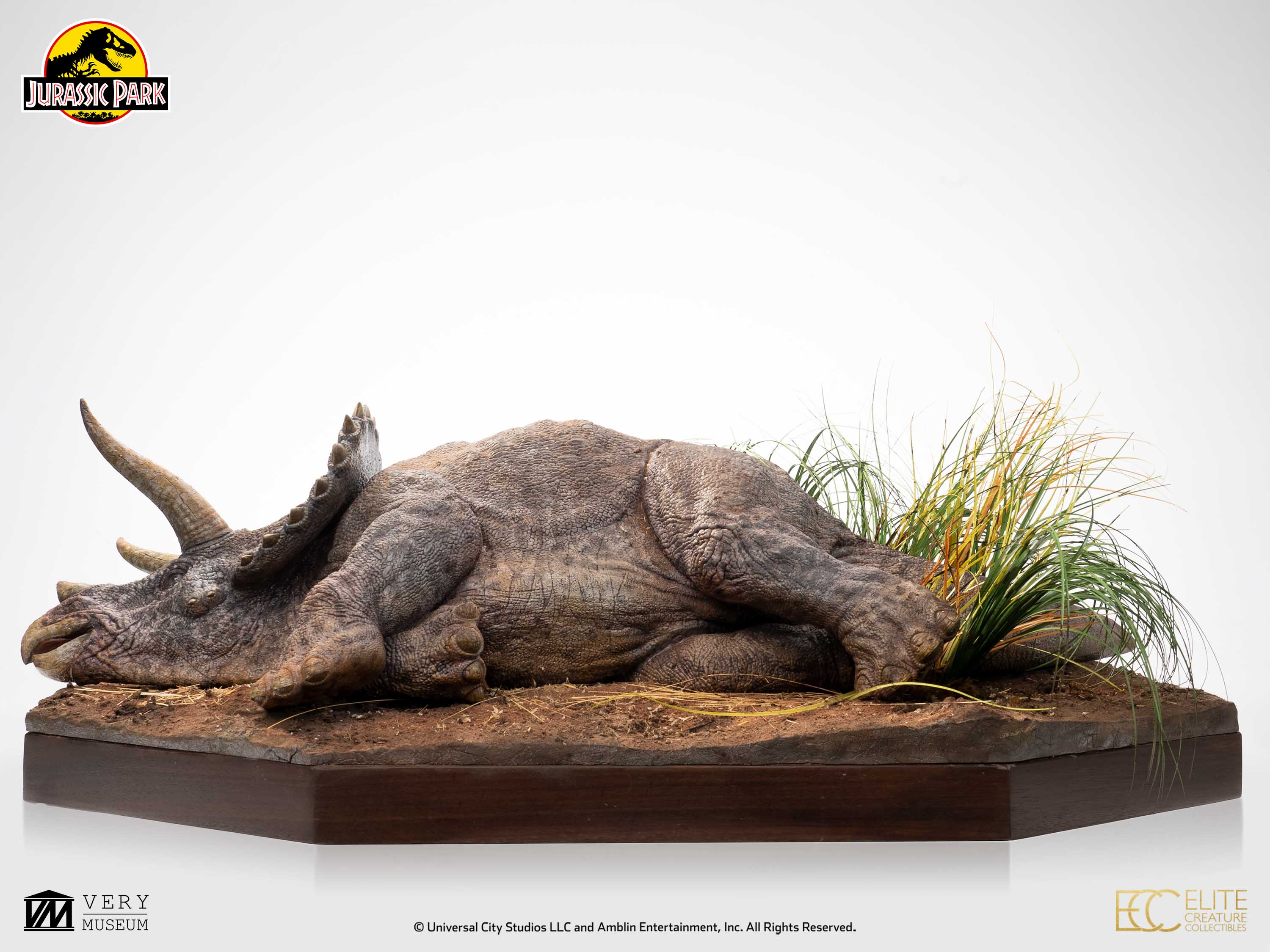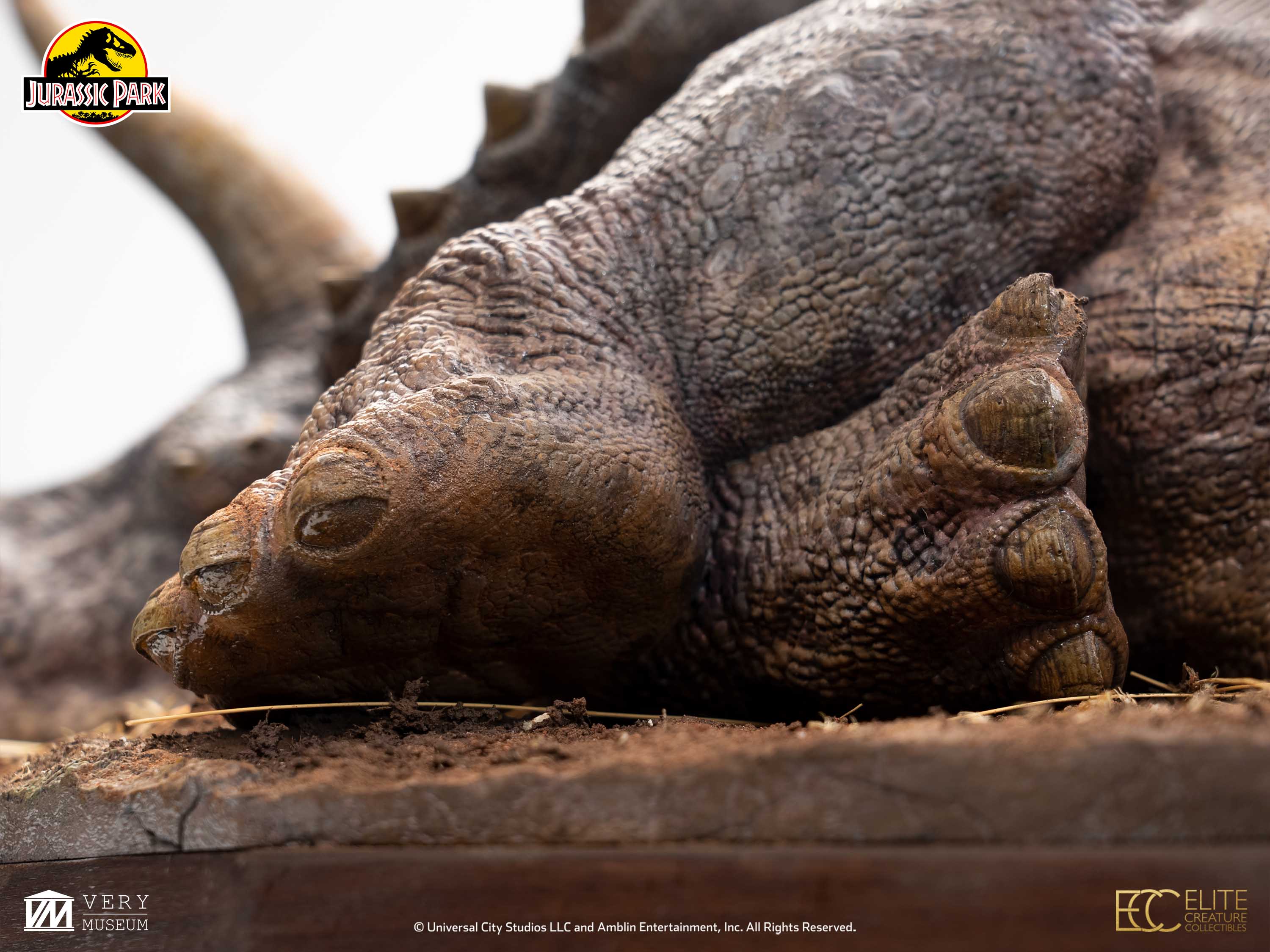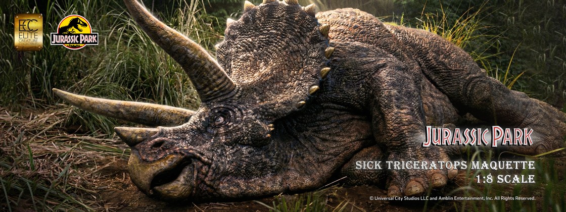 Elite Creature Collectibles is proud to present the Jurassic Park Sick Triceratops 1:8 Scale Maquette, faithfully recreated from the 1993 film. Sculpted by renowned ILM artist Bitan and meticulously painted by SWS Jurassic Park key artist Joey Orosco, this maquette captures the emotional weight and realism of one of the film’s most iconic scenes.