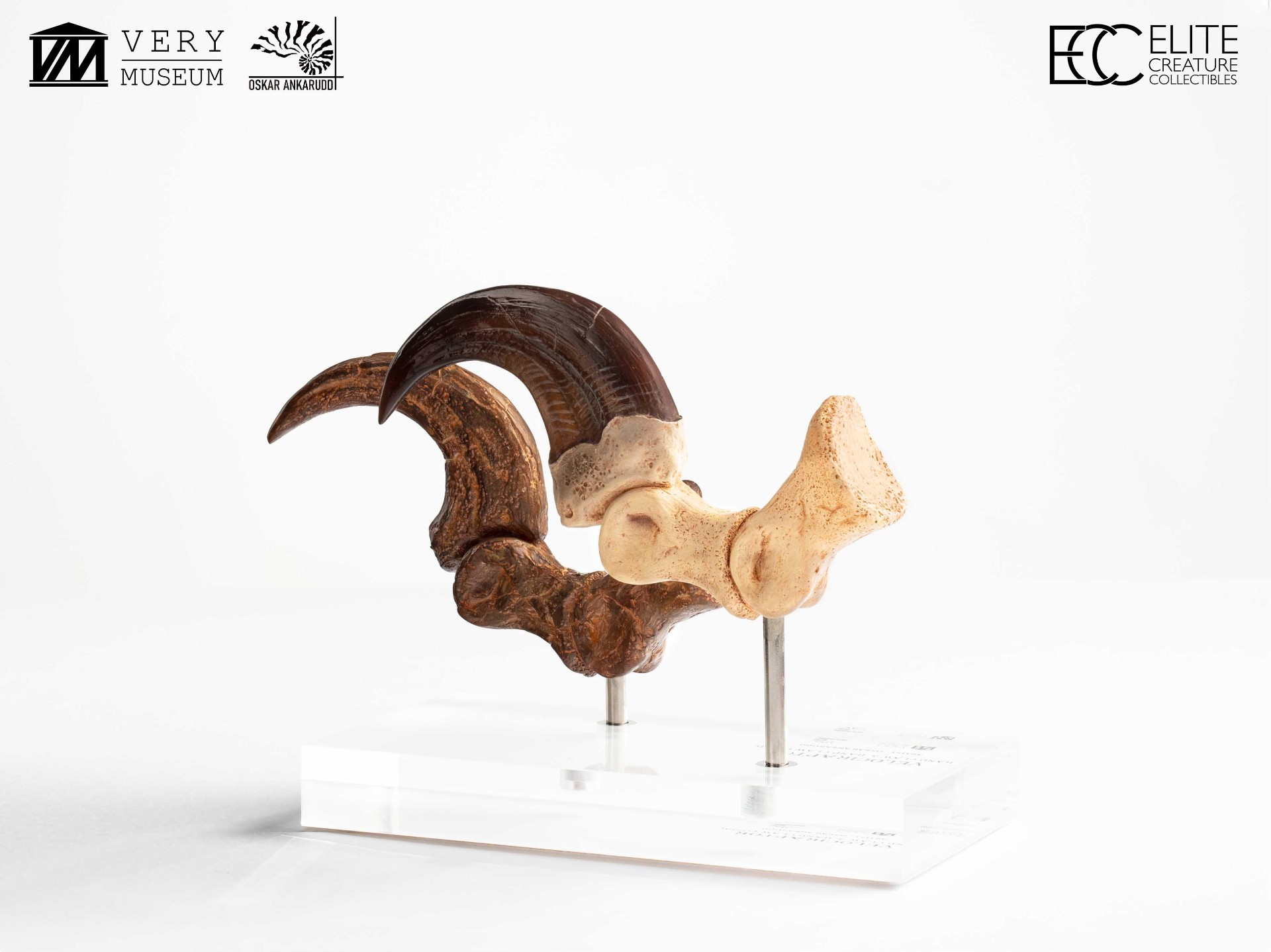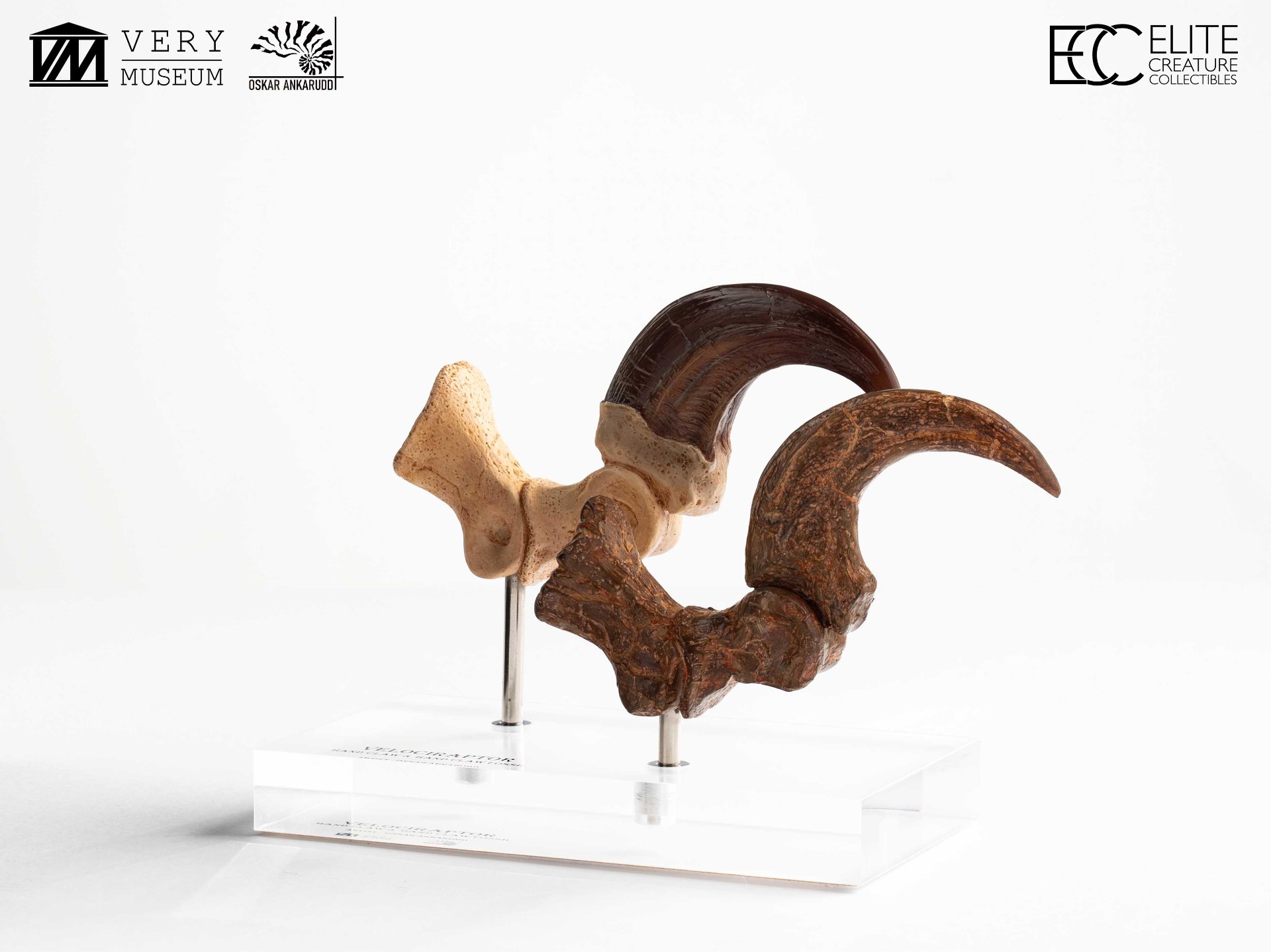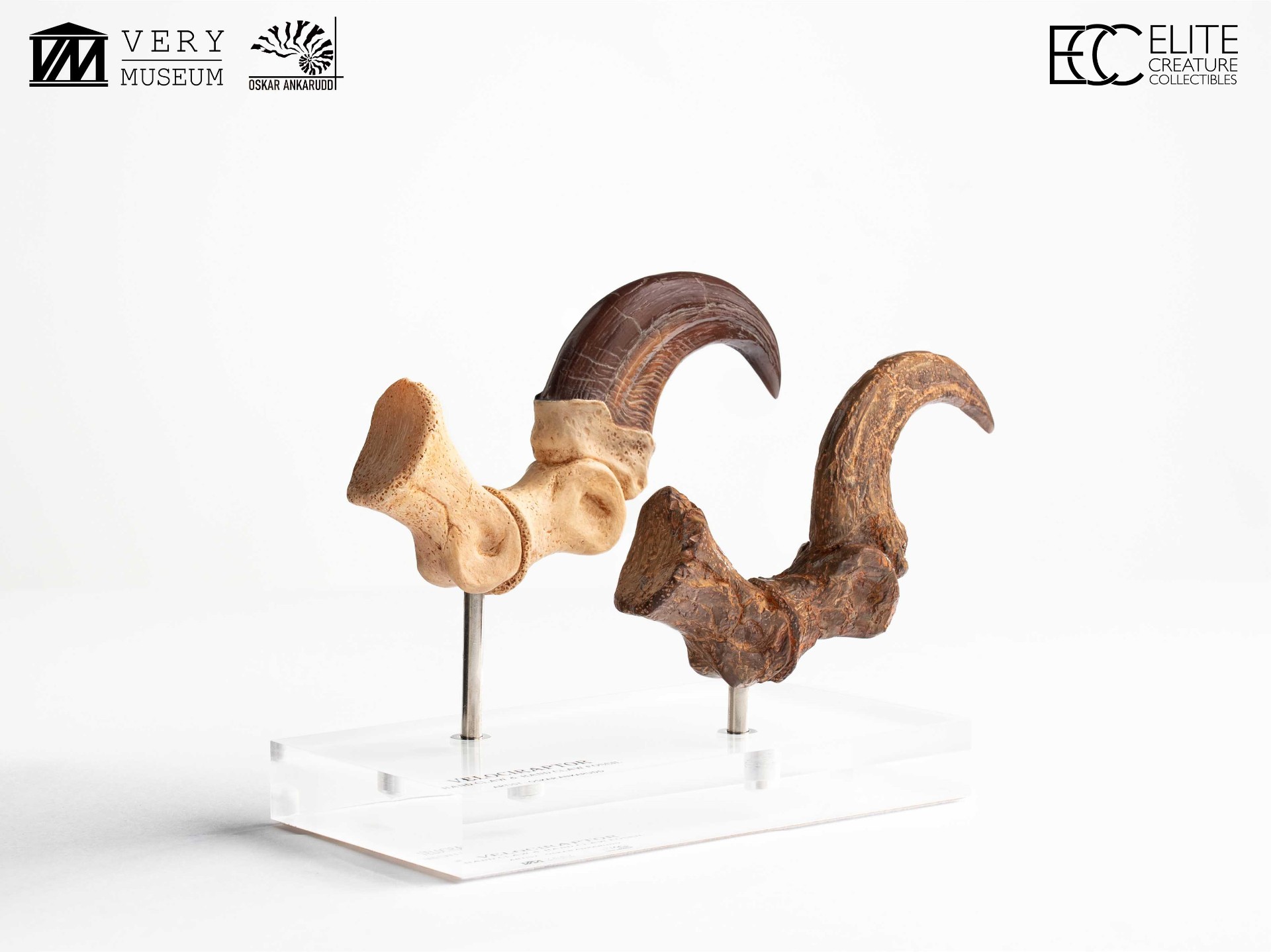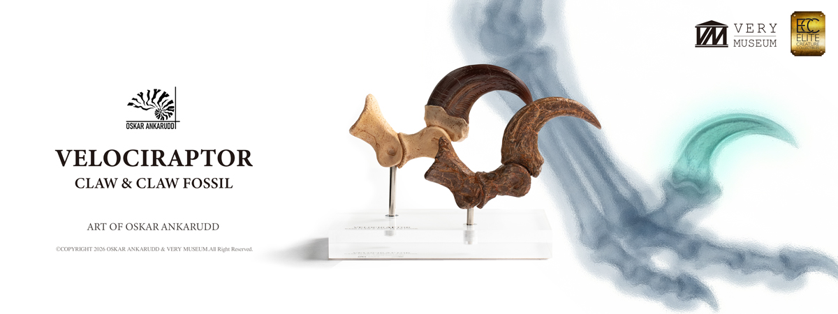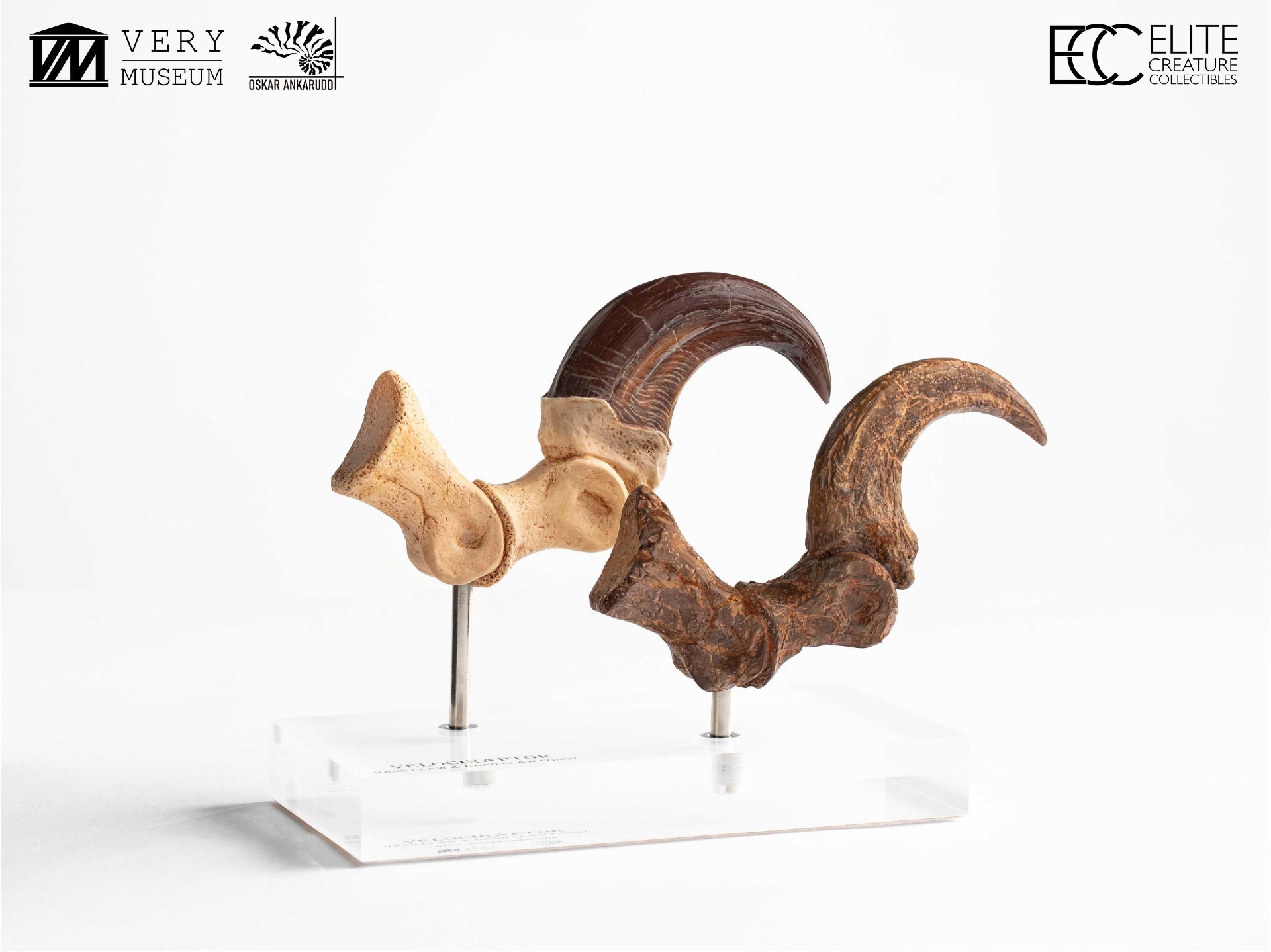 This unique set allows collectors to compare a Velociraptor foot claw alongside a fossilized claw, highlighting the contrast between anatomical reconstruction and paleontological reference. Both claws were hand-sculpted and hand-painted by Very Museum key artist Oskar Ankarudd. Each claw is displayed on a prop-auction–style acrylic base and can be removed for closer inspection.