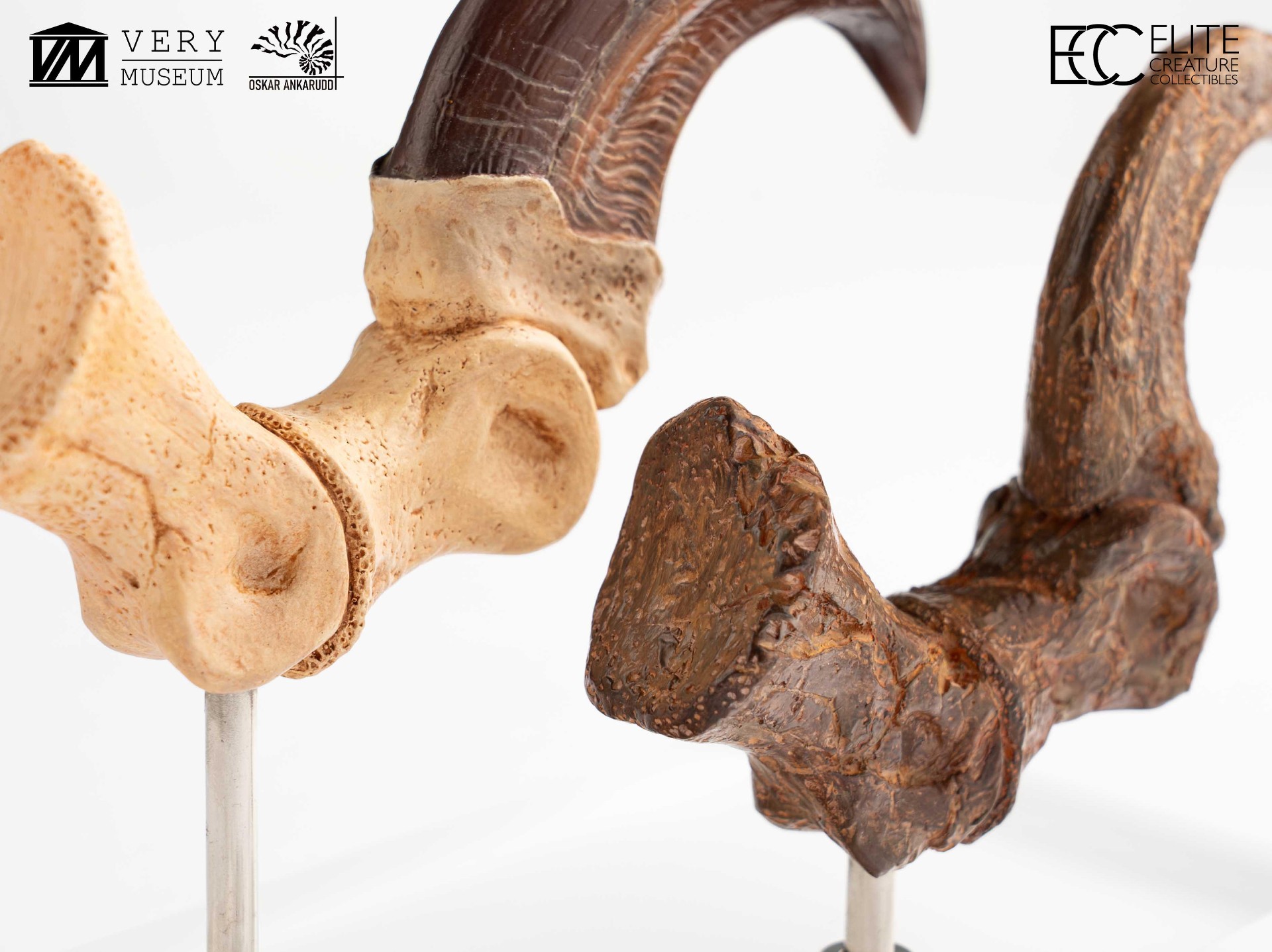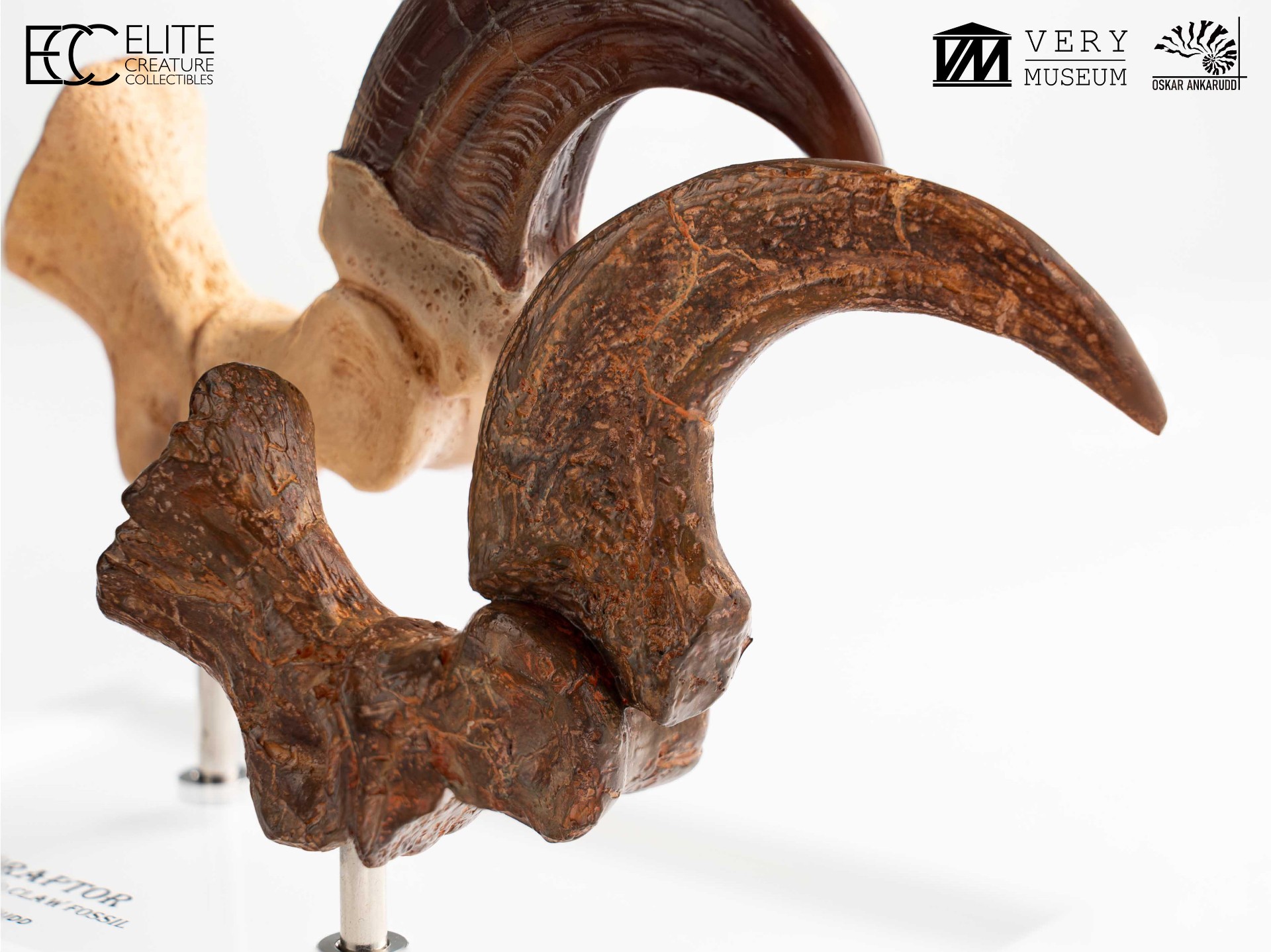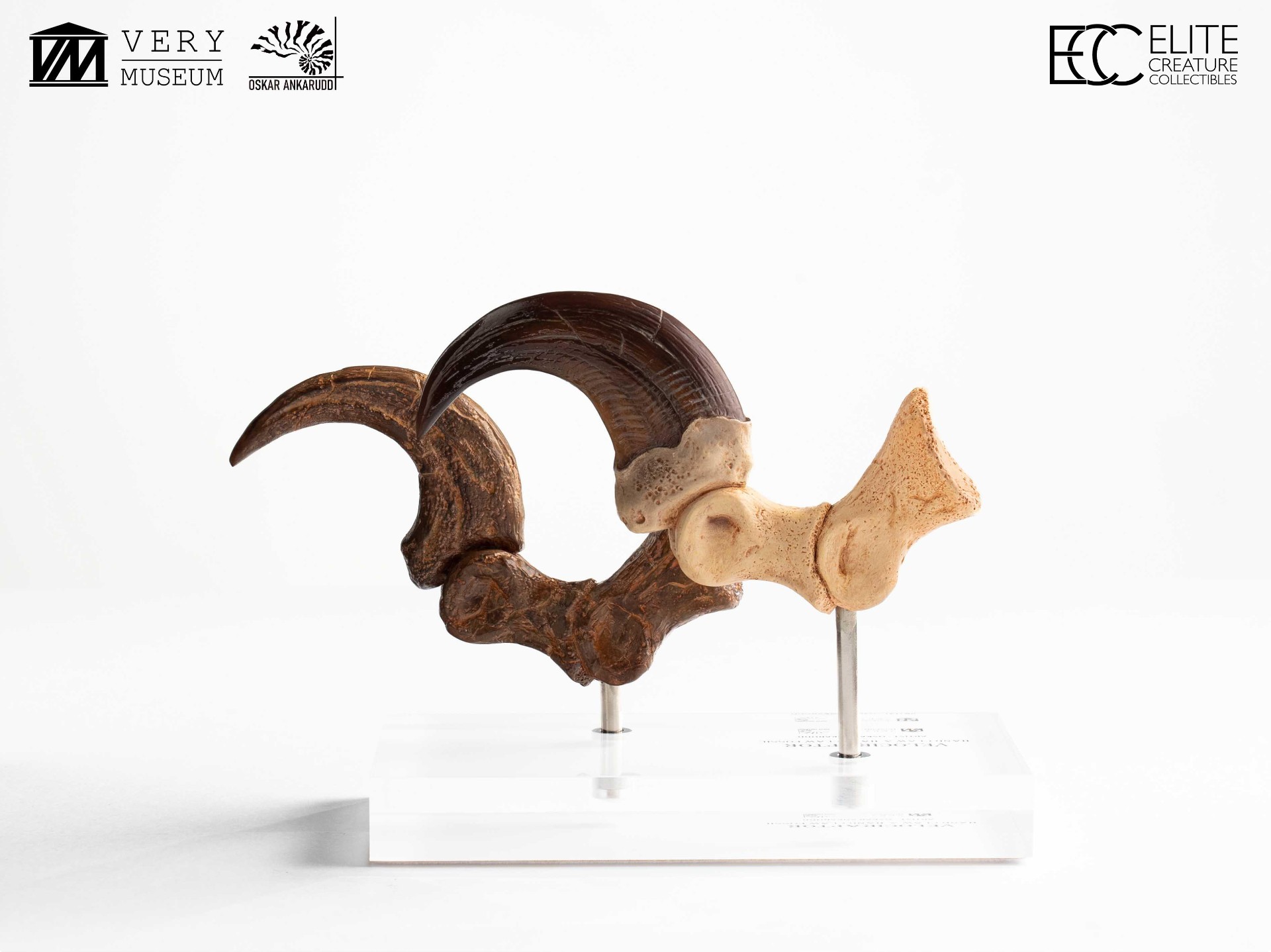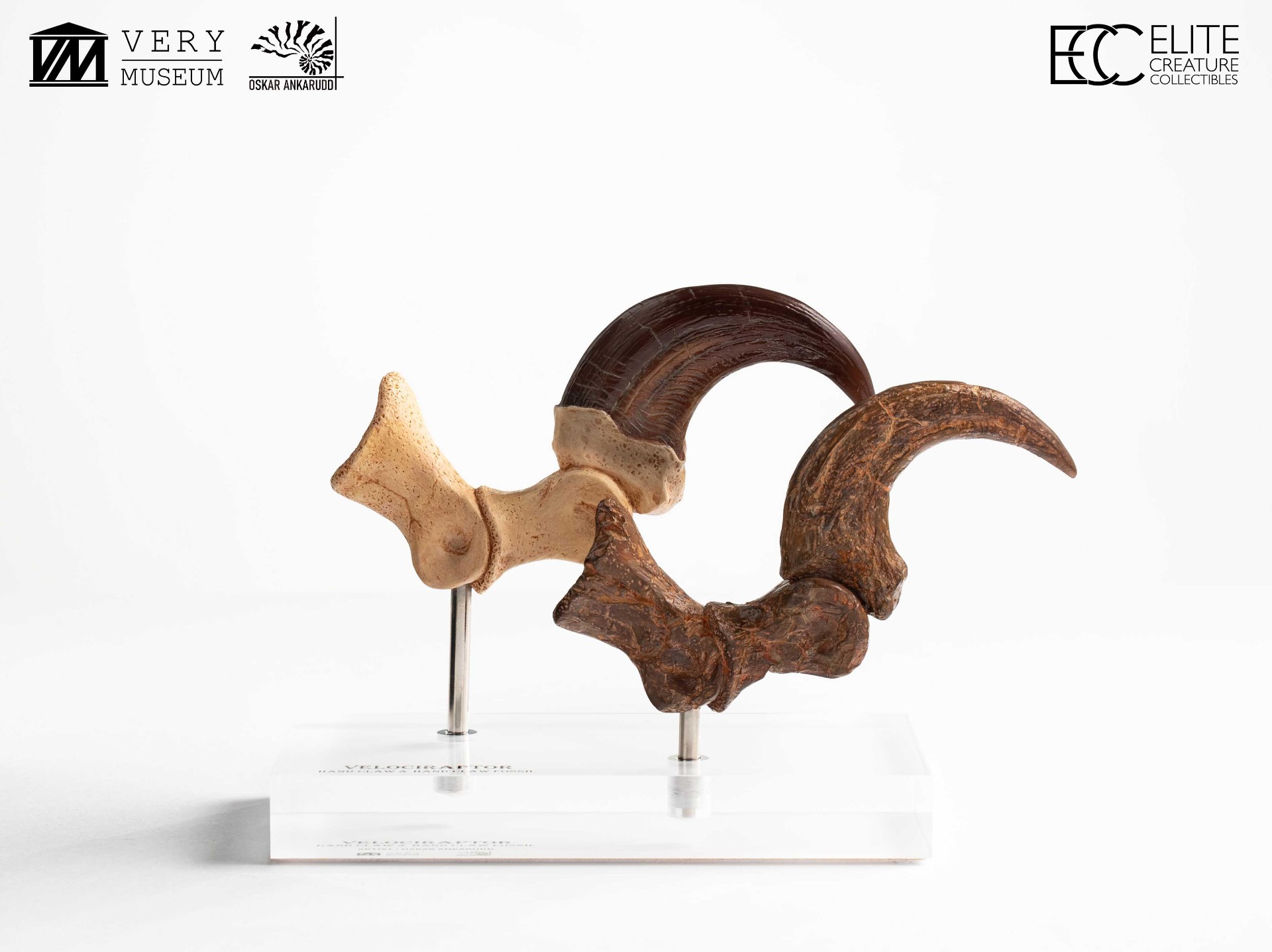 This unique set allows collectors to compare a Velociraptor foot claw alongside a fossilized claw, highlighting the contrast between anatomical reconstruction and paleontological reference. Both claws were hand-sculpted and hand-painted by Very Museum key artist Oskar Ankarudd. Each claw is displayed on a prop-auction–style acrylic base and can be removed for closer inspection.