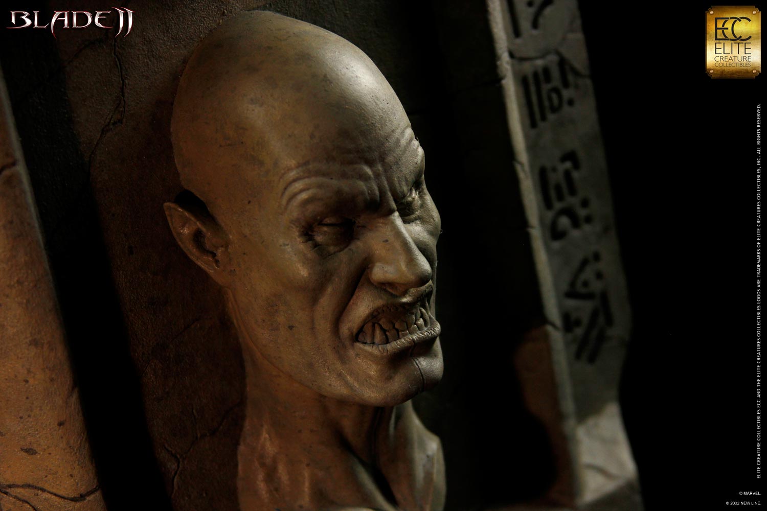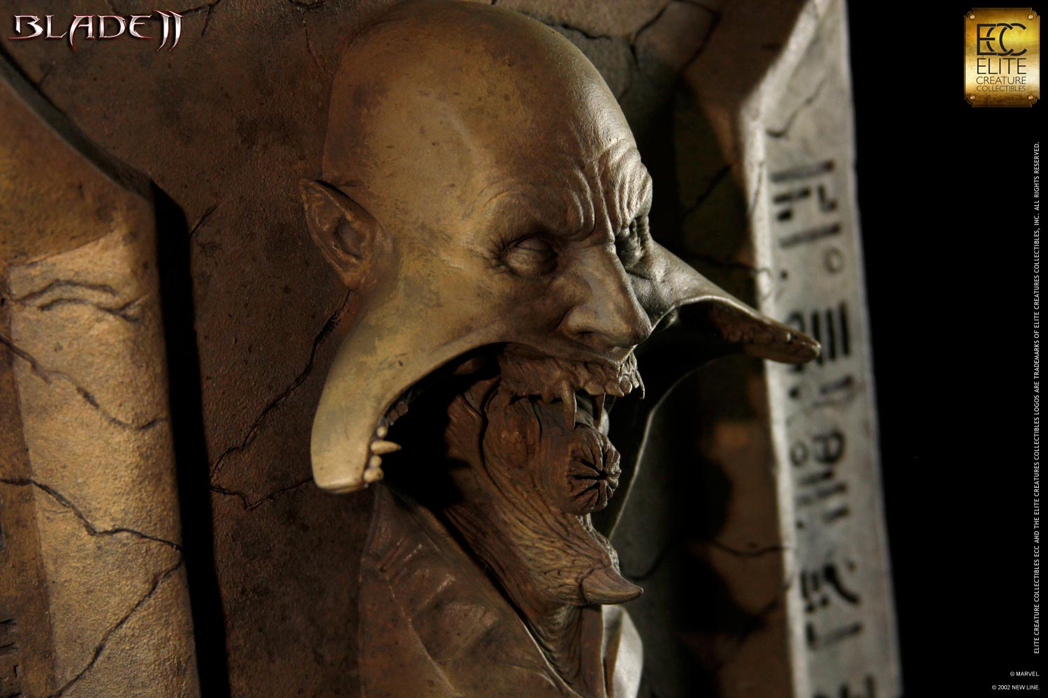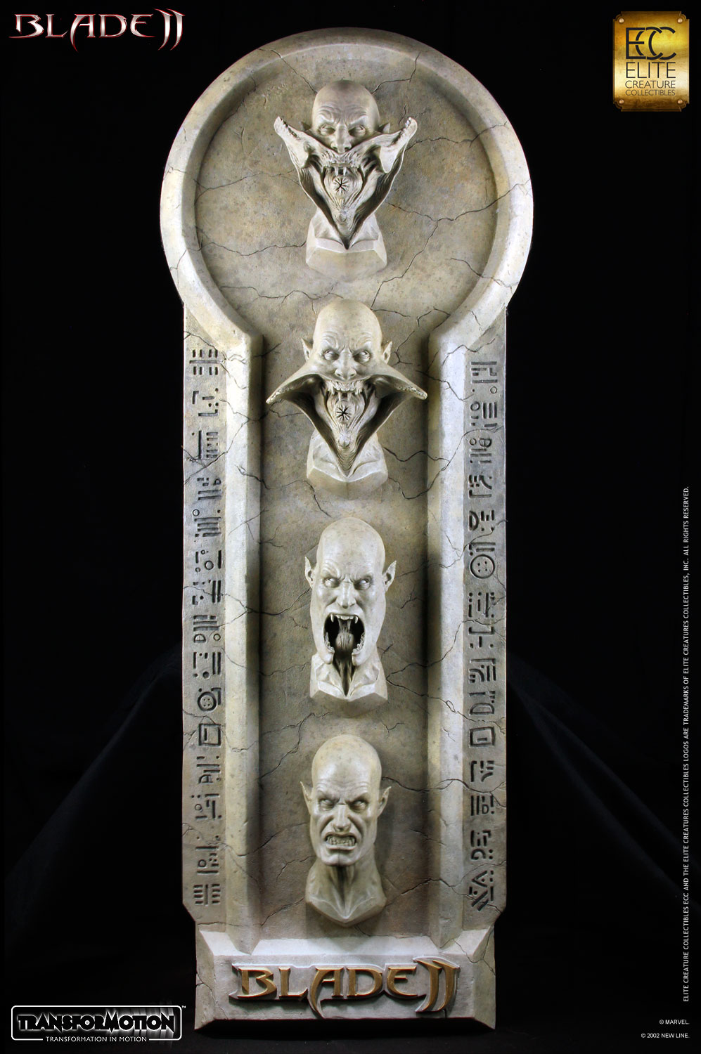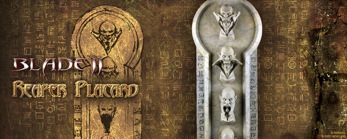 Elite Creature Collectibles presents it's “transformation in motion” placard. The first in a line of Transformotion collectibles – The Placard is a four-in-one sculpture representing the different stages of the Blade 2 Reaper as it prepares to bite. The Transformation Placard is sculpted by Special FX Master Brian Wade, and is based on an unused creature concept by Constantine Sekeris for the film Blade 2. Standing approximately 35 inches tall, the horrifying Reaper is set against an authentic sandstone effect wall, engraved with vampire glyphs. This is the perfect piece to complete your Blade 2 collection!